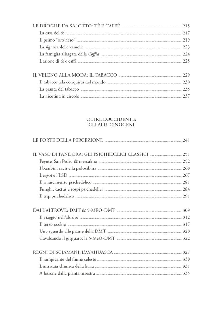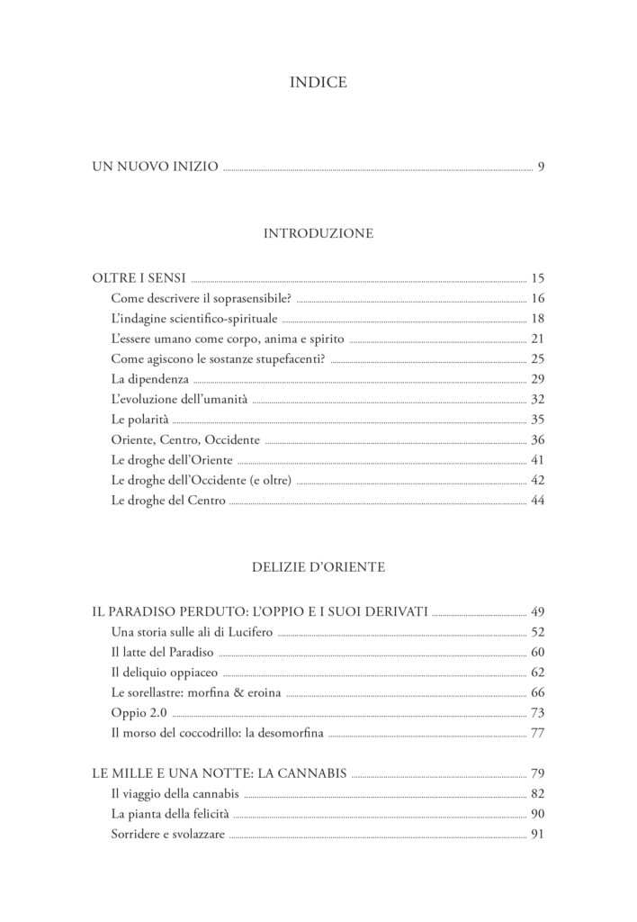 Come agisce una determinata droga sull’organismo, sulla psiche e sull’evoluzione spirituale di un individuo? Qual è il suo effetto sulla vita di un singolo e sul percorso evolutivo dell’umanità intera? Le droghe sono così strettamente intrecciate alla storia dell’uomo da costituirne un elemento fondamentale, benché spesso poco considerate. Conoscere a fondo il ruolo storico e gli effetti sia fisici che spirituali di ognuna, permette invece di affrontarle in maniera consapevole e libera da pregiudizi o condizionamenti. Cannabis, oppio, fentanyl, ecstasy, cocaina, LSD, caffè, tabacco, ayahuasca, alcol, ketamina, sono solo alcune delle sostanze trattate in un testo che si propone come una guida completa verso un tema che ci vede coinvolti quotidianamente.