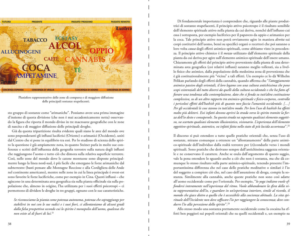 Dopo anni di ricerche, finalmente è stato pubblicato il mio ultimo libro sulle droghe, che include, aggiorna e amplia notevolmente il mio precedente “Paradisi Artificiali” di quasi dieci anni fa. Può essere considerato un vero e proprio “atlante scientifico-spirituale” che affronta la gran parte delle sostanze stupefacenti oggi note, illustrandone sia la storia, arricchita da numerose citazioni artistiche e letterarie, sia gli effetti, non solo dal punto di vista biochimico ma soprattutto riguardo alla loro azione sulle componenti psichiche e spirituali dell’essere umano. Dietro ogni pianta e sostanza sono infatti attive forze che provocano determinati effetti spirituali nel consumatore: dal carattere di negazione della materia tipico del passato, portato per esempio dall’oppio, a quello spiccatamente materialista del tempo presente, come per la cocaina, fino alla percezione di altri livelli di realtà che potranno essere conosciuti dall’uomo solo in epoche future, ma che sono precocemente aperti dagli psichedelici. In uno stile narrativo sempre brillante e coinvolgente, questo libro rappresenta un appassionante viaggio di scoperta che offre per la prima volta una visione completa del rapporto tra droghe e uomo, inteso come unità di corpo, anima e spirito.